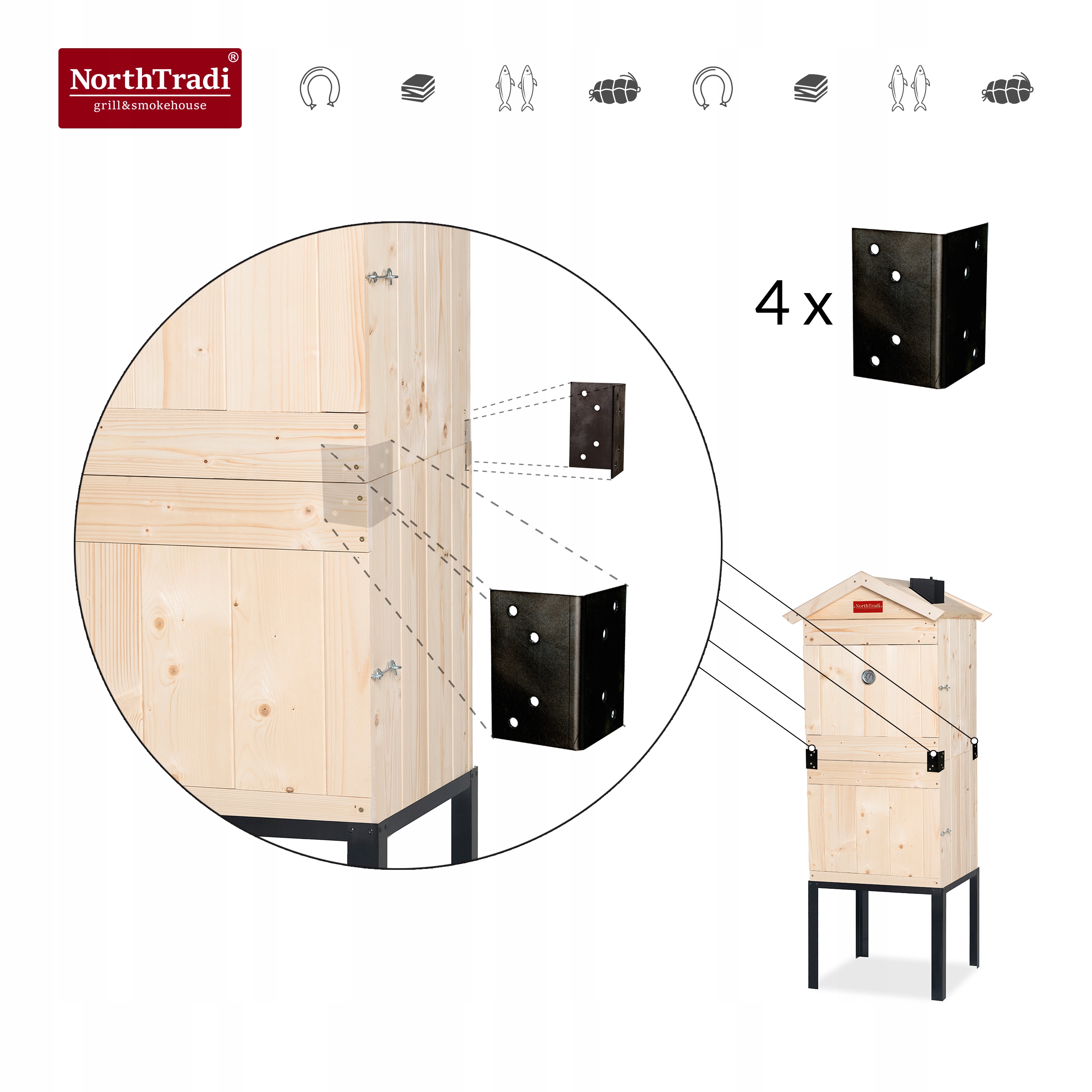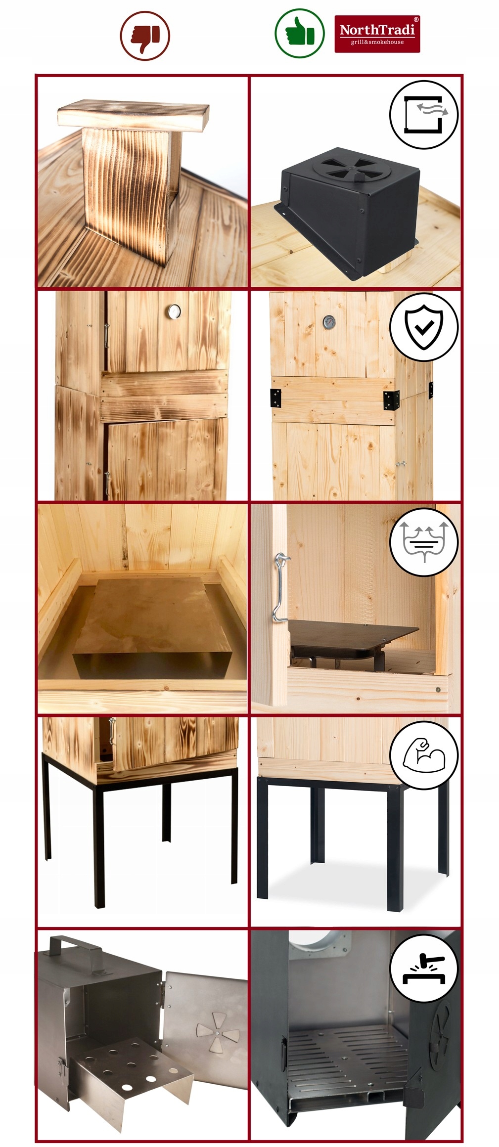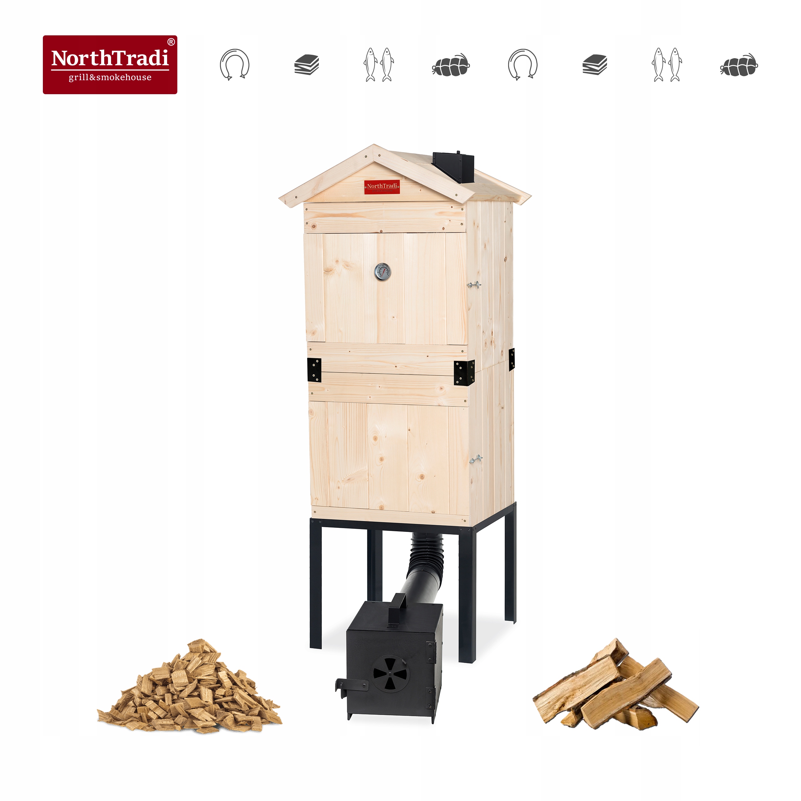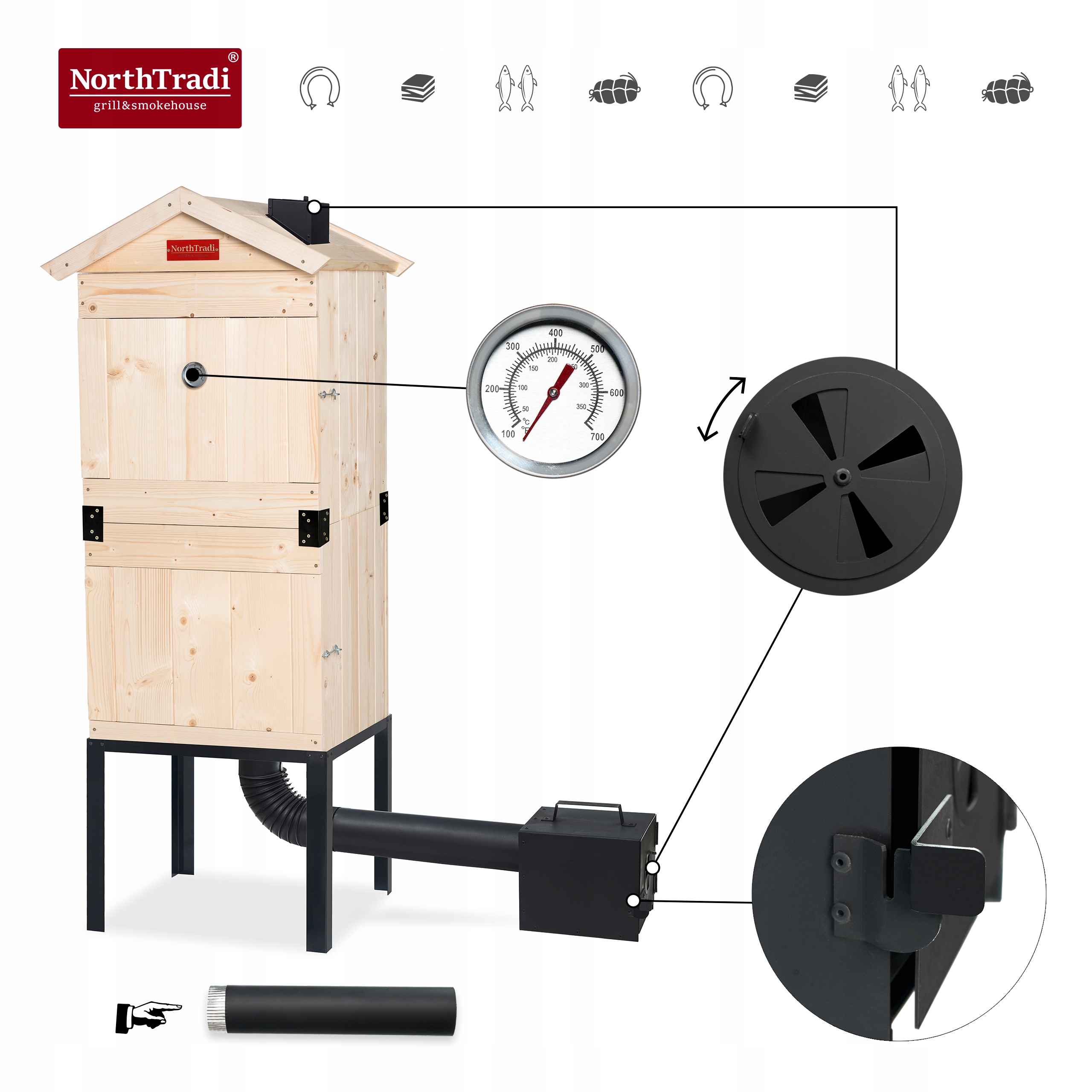 - NorthTradi: solidny metalowy kominek z regulacją – precyzyjne sterowanie przepływem dymu i skuteczne odprowadzanie wilgoci, bez kapania kondensatu na wędzonki.